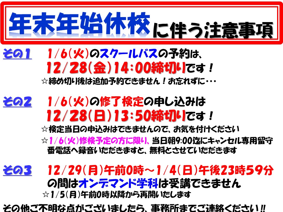 📞 ご不明な点がございましたら、休校前に事務所までお問い合わせください。